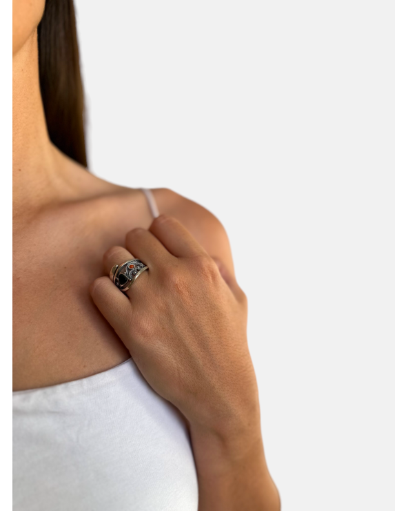 Anillo ajustable en plata de ley 925 con aplicaciones de azache y coral.
