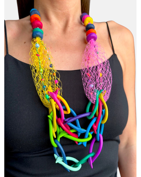 Collar Sardiñada en arcilla polimérica de varios colores con cuentas y abalorios montado en cordón textil hecho a mano.