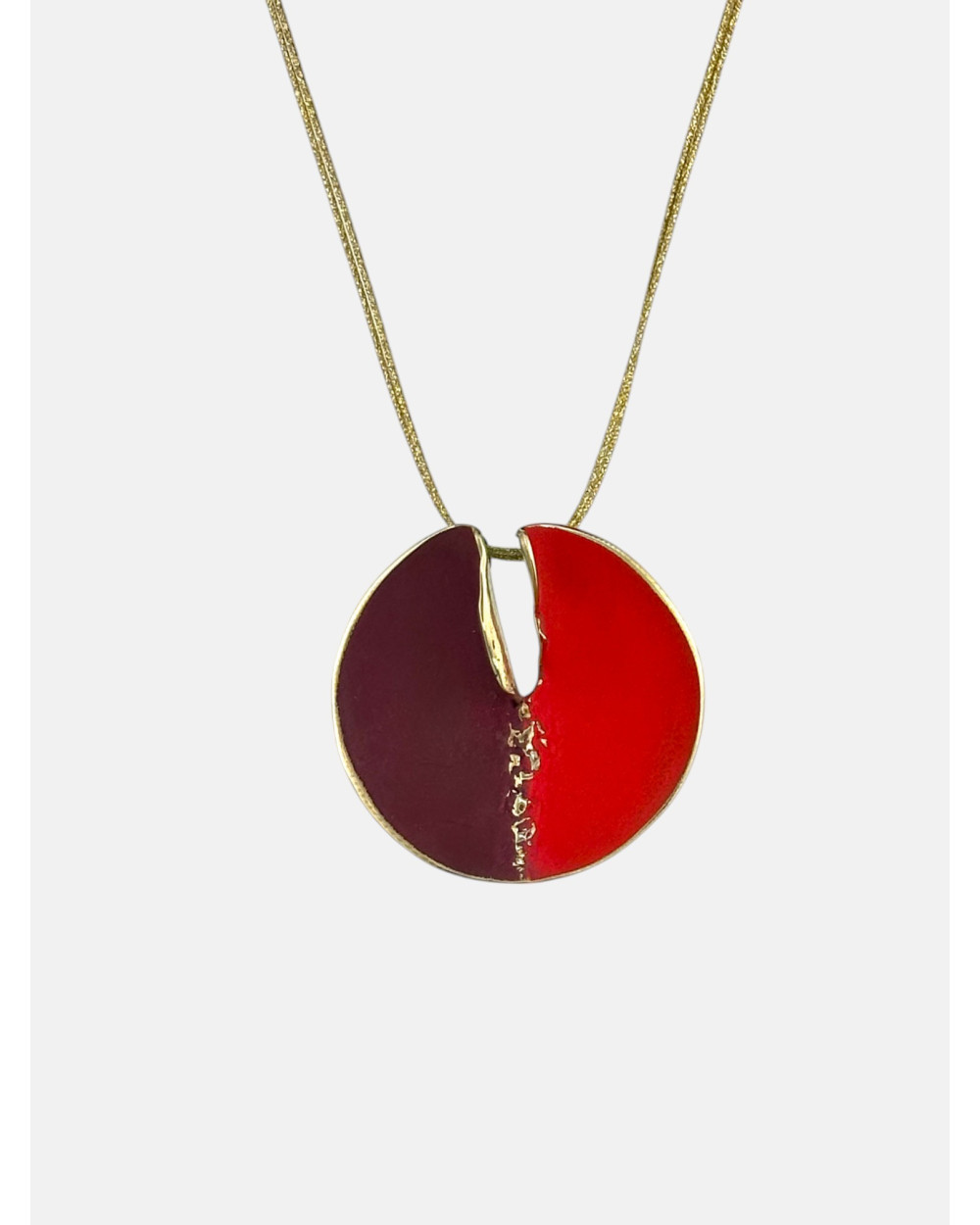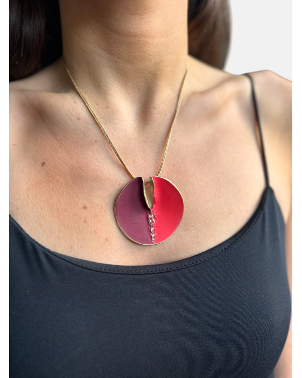 Colgante Shinny Diamond en bronce patinado en rojo y burdeos montado en cordón textil hecho a mano.