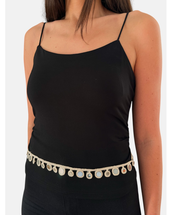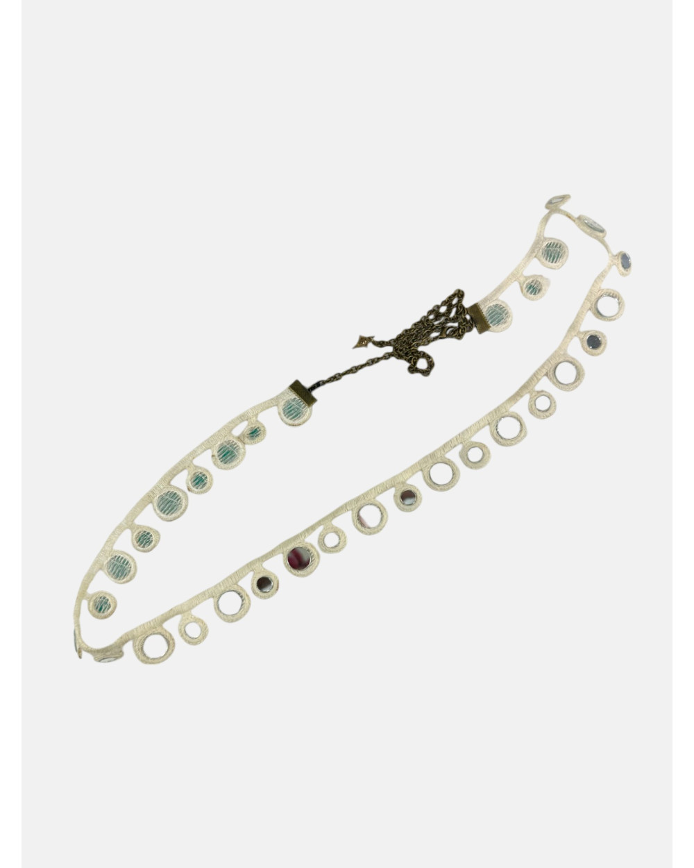 Cinturón Lunar en hilo blanco con cristales de espejo sellados uno a uno y cierre ajustable.