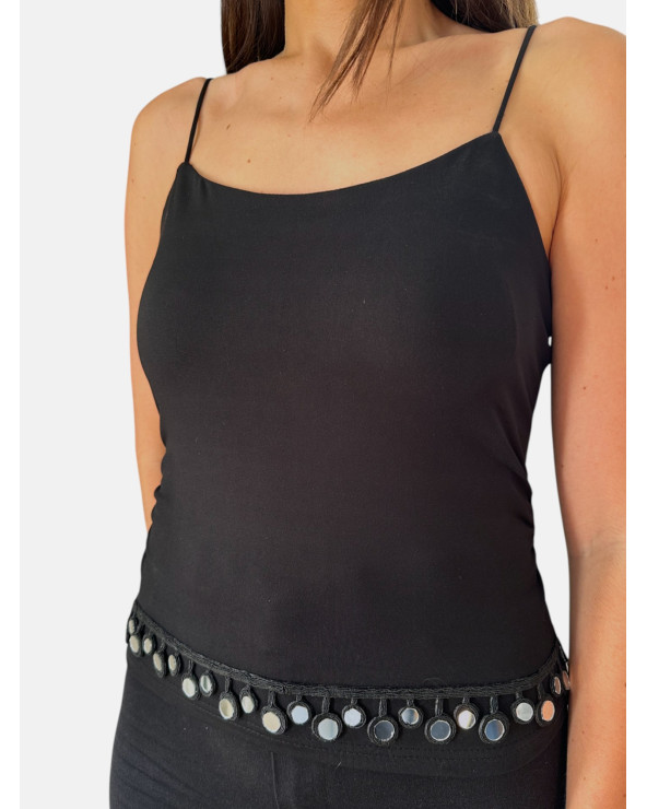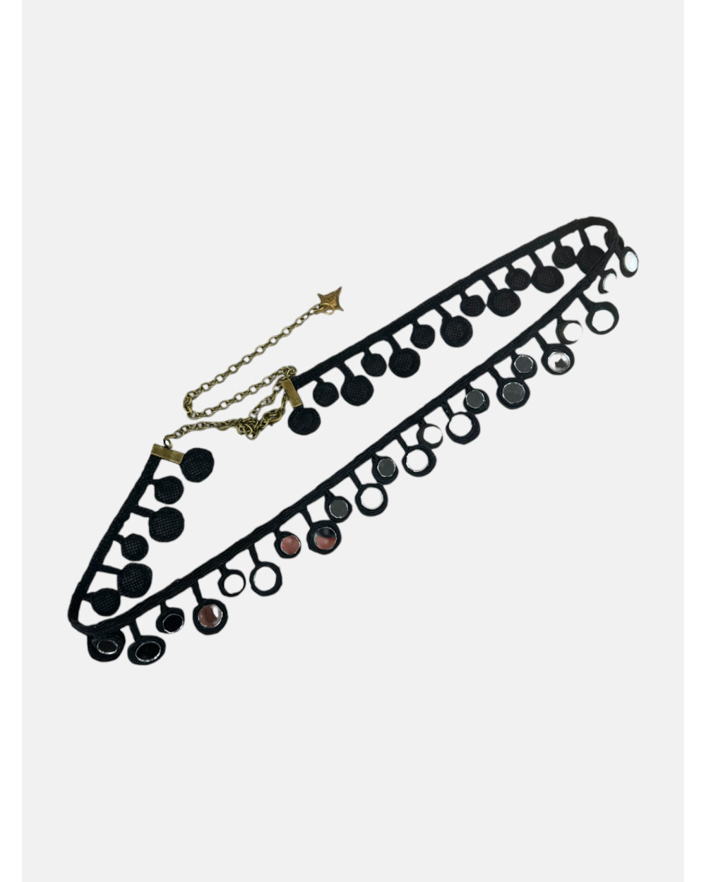 Cinturón Zafiro en hilo negro metalizado con cristales de espejo sellados uno a uno y cierre ajustable.