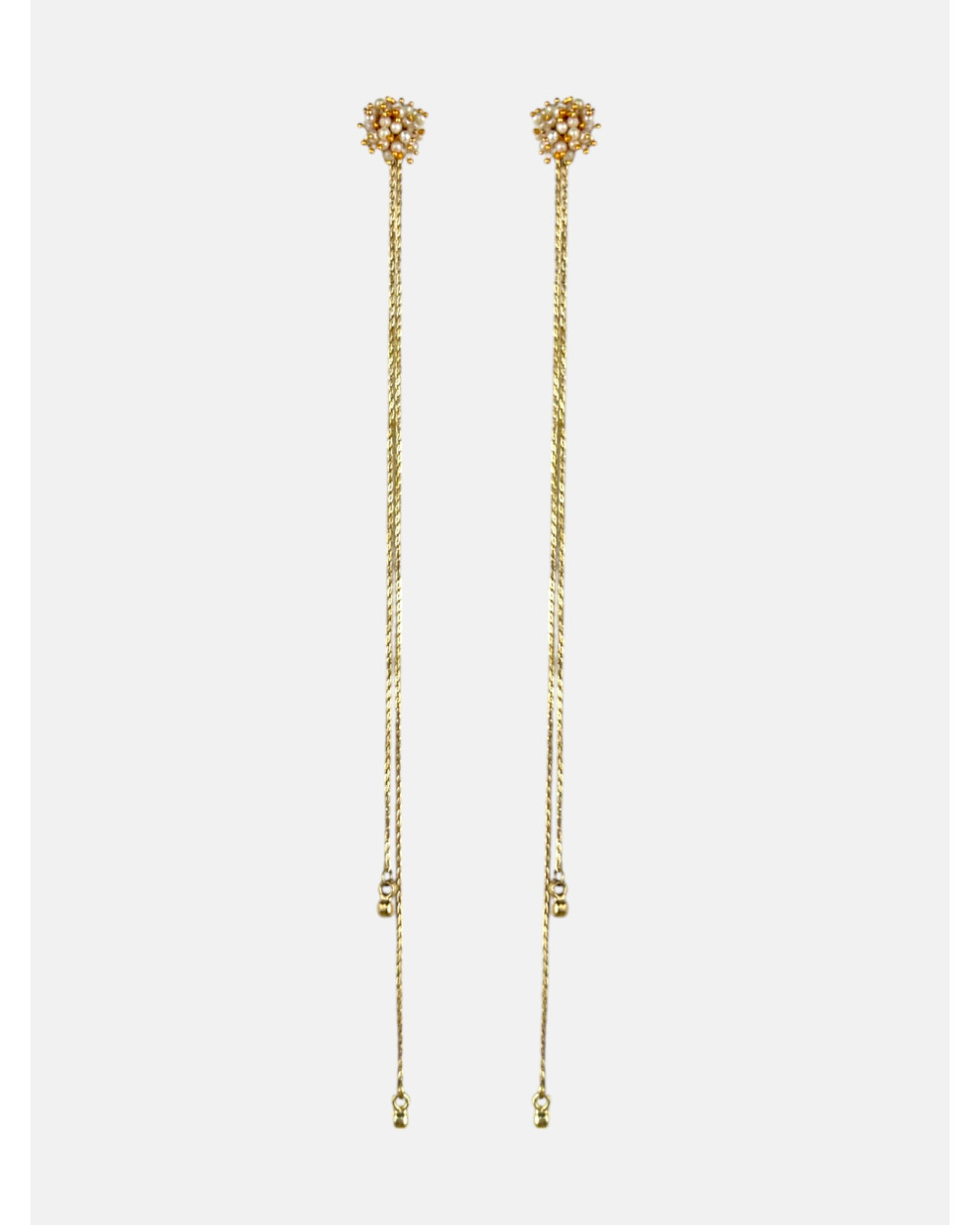 Pendientes Aura en metal de fundición con partes de latón y acabado dorado con cuentas de abalorios blancos incrustadas a mano.