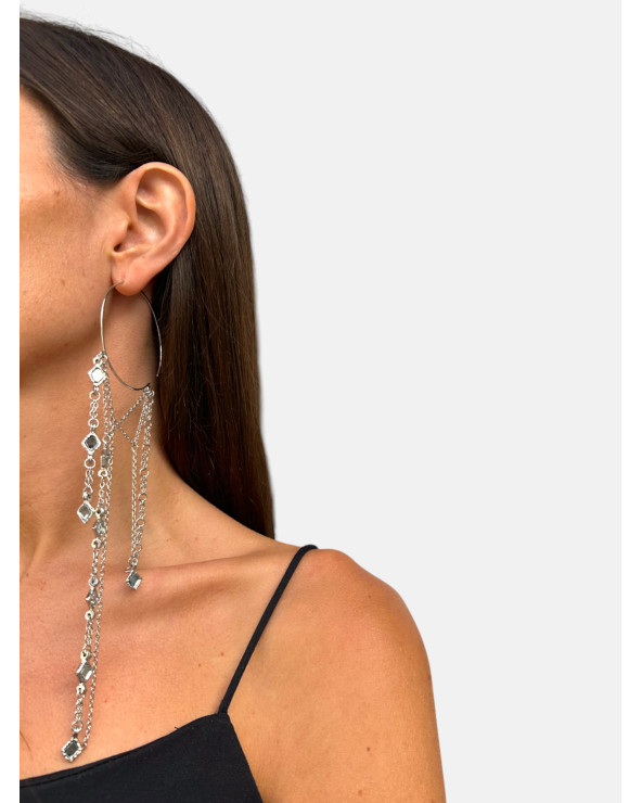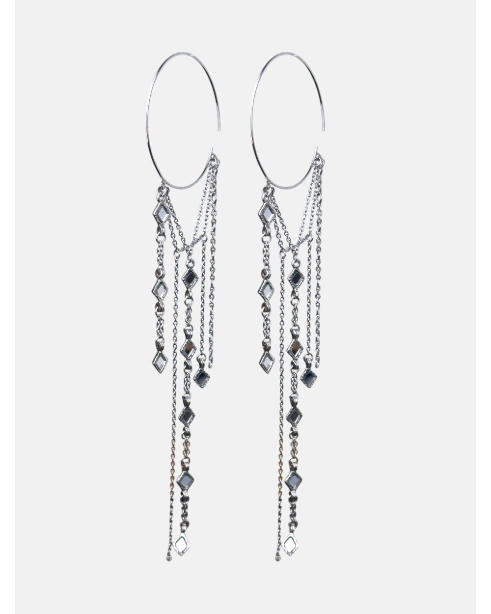 Pendientes Olea en latón con baño de plata con cadenas y espejos en forma de rombo engarzados a mano sobre aro.