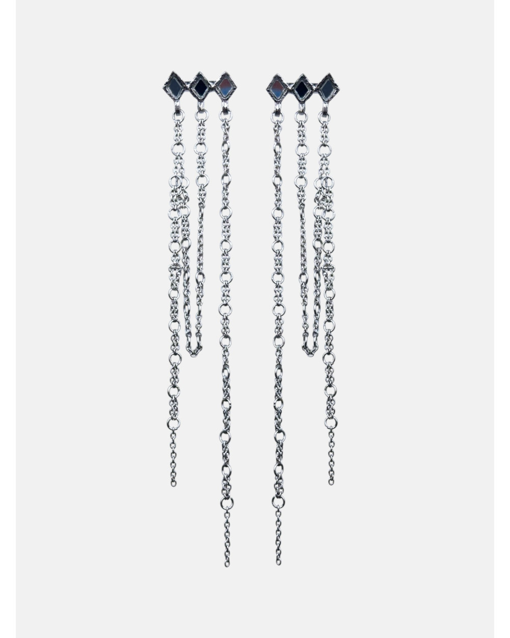 Pendientes Nyssia en latón con baño de plata con cadenas y espejos en forma de rombo engarzados a mano con cierre de presión.