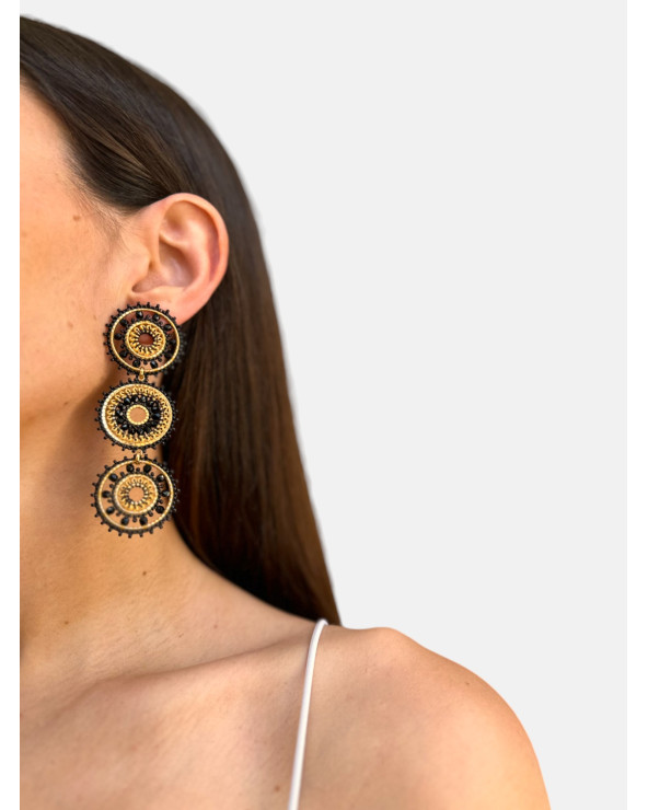 Pendientes Mandala triple grandes en cristal checo, piedras semipreciosas y miyuki chapados en oro de 18K cosidos a mano.