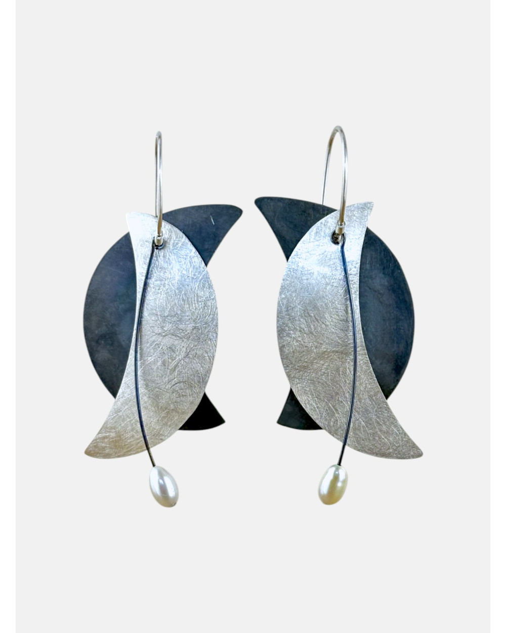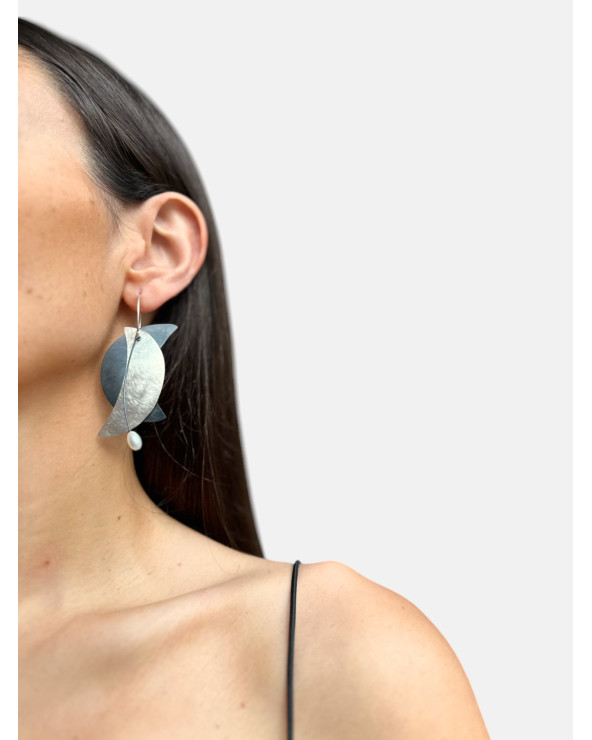 Pendientes Dent en plata de ley 925 acabado brillo texturizado y óxido con perla natural hechos a mano.