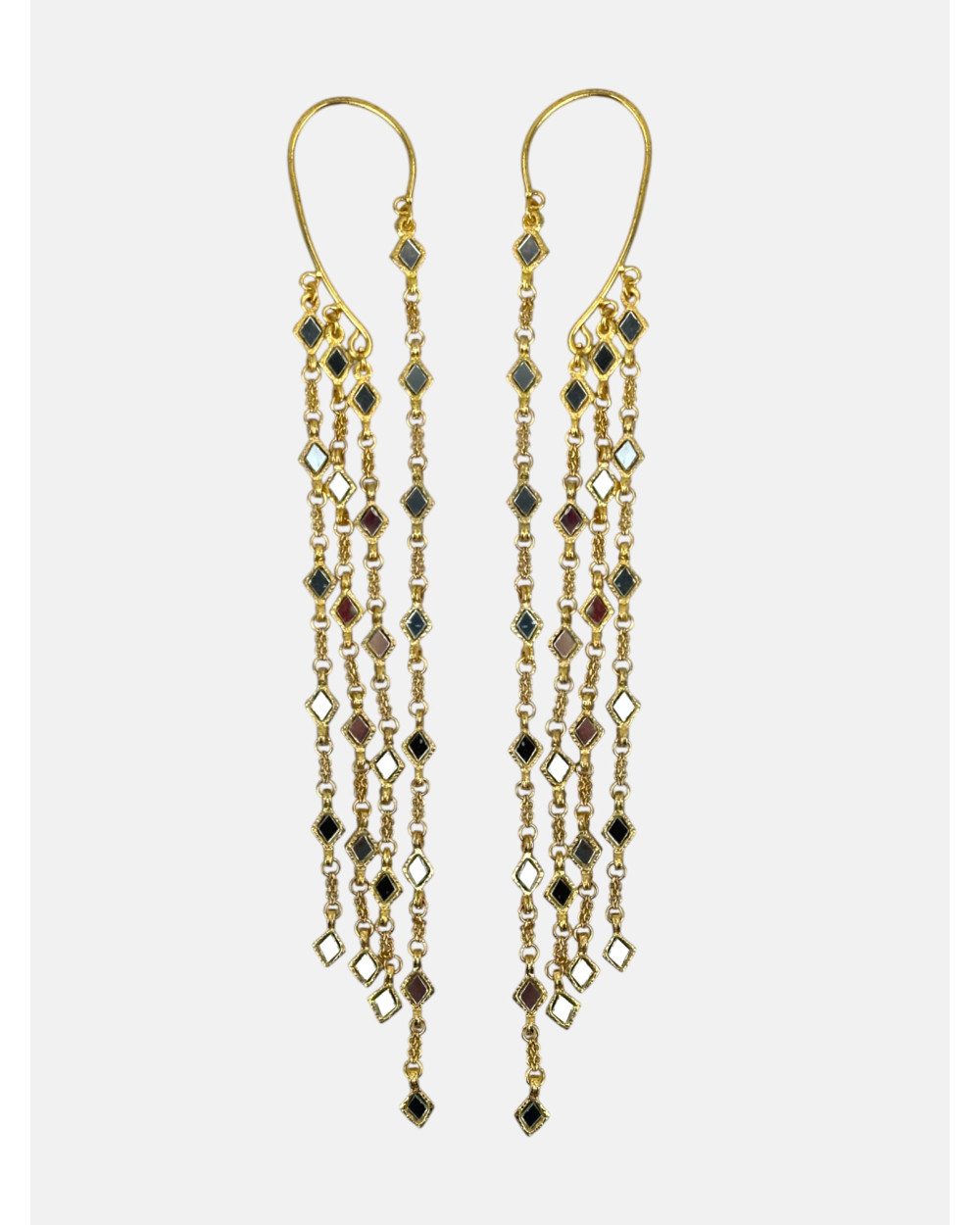 Pendientes Orelis en latón con baño de oro con cadenas y espejos en forma de rombo engarzados a mano con cierre tipo earcuff.