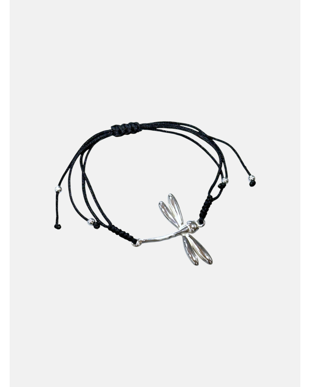 Pulsera Libélula en plata de ley 925 acabado brillo montada en macramé de hilos de nailon.